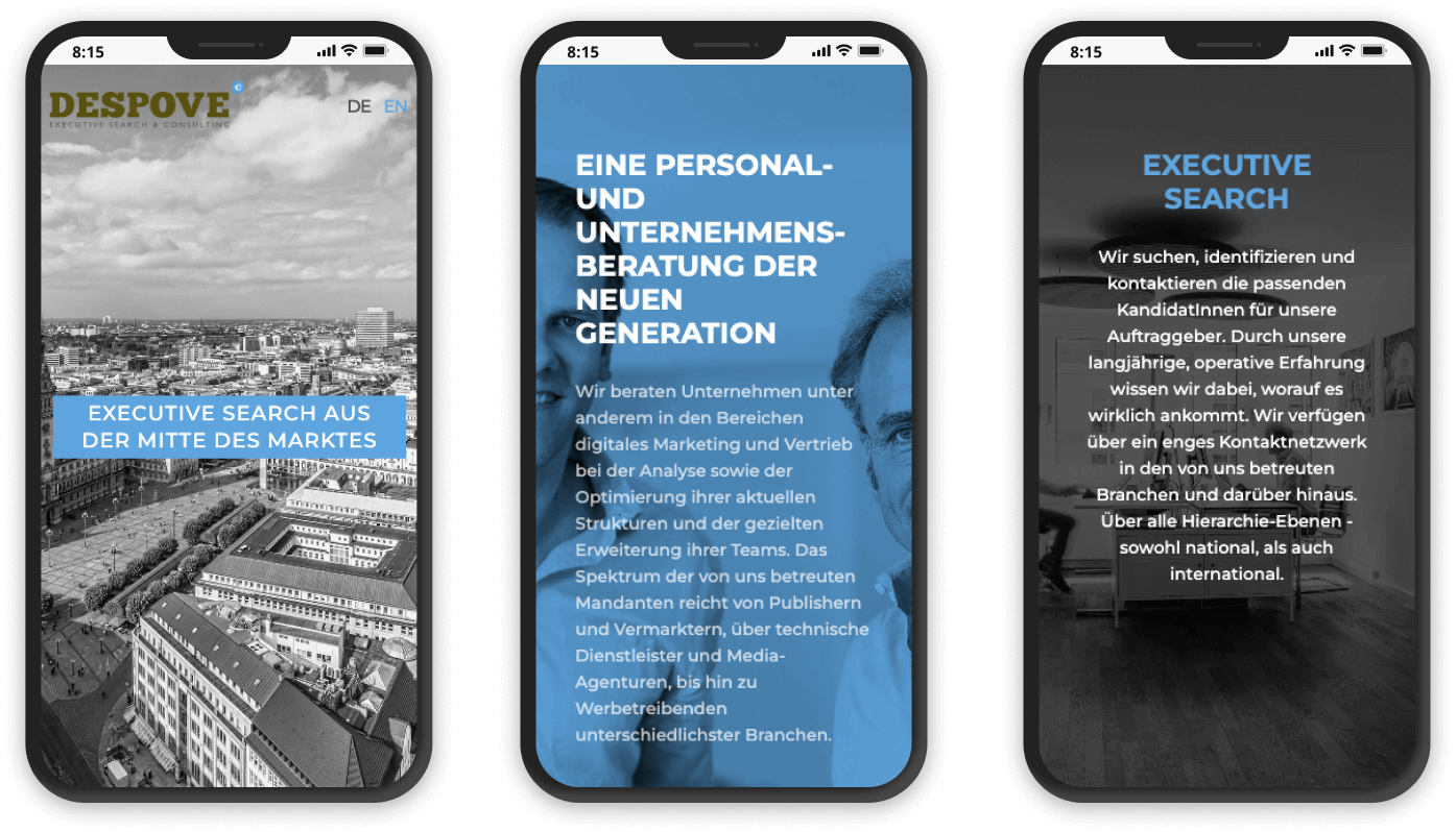 Für unseren Kunden DESPOVE GmbH, ein führendes Unternehmen im Bereich Executive Search und Consulting, haben wir eine Website entwickelt, die höchste Ansprüche an Design, Funktionalität und Nutzerfreundlichkeit erfüllt. Aufbauend auf dem bestehenden Corporate Identity (CI) des Unternehmens, haben wir mit unserer Expertise im Webdesign, Webflow Design sowie der technischen Integration von Jekyll und CloudCannon Hosting eine moderne und leistungsstarke Online-Präsenz geschaffen.